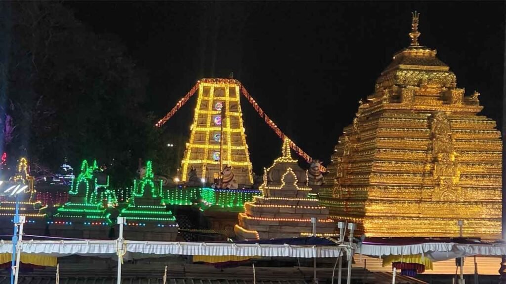 Sri Bhramarambika sametha Mallikarjuna swamy Devasthanam or Srisailam Temple is a Hindu temple dedicated to the deities Shiva and Parvati, located at Srisailam in the Indian state of Andhra Pradesh. It is significant to the Hindu sects of both Shaivism and Shaktism as this temple is referred to as one of the twelve Jyotirlingas of Shiva and as one of the eighteen Shakti pithas, centres of the Hindu goddess. Shiva is worshiped as Mallikarjuna and is represented by the lingam. His consort Parvati is depicted as Bhramaramba.